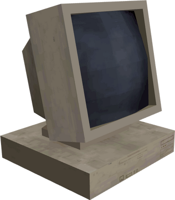 A computer mouse, CRT Monitor, Desk and keyboard.
